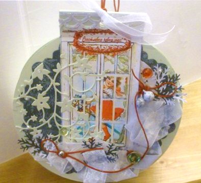 Давно купила нож для Биг шот - белый резной круг по центру. Не знала как применить, а тут сложилось :) Наклеила на вырубку рисунок,  вырезанный из рисовой бумаги (которую купила к прошлому новому году и так и не применила). Кстати опробовала клеевую ручку из своего магазинчика, теперь смело рекомендую :) Клей похож на канцелярский, только он специальный скраповый - не портит рисунки и фото, не желтеет и хорошо схватывает. Цветочек вырезала из обрезка бумажки, веточки еловые - все та же MS, белый крупный брадс, белое кружево, лента с пушистыми вставками.