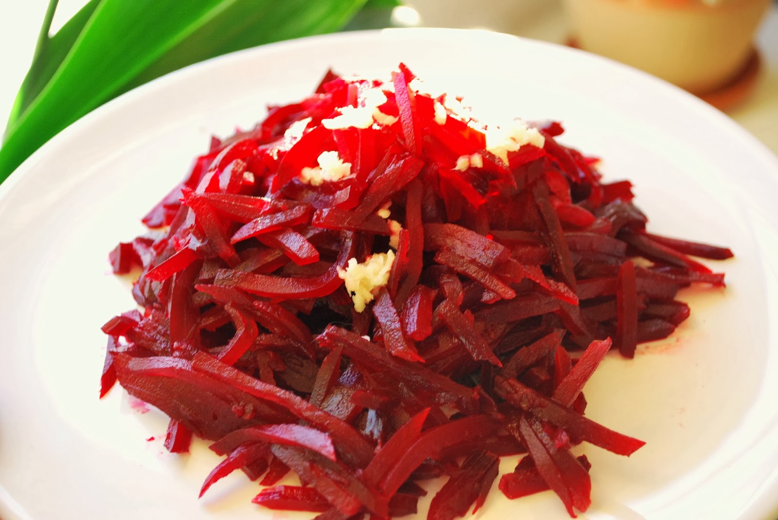 Пока все там благополучно варится, я шинкую вареную свеклу и выдавливаю чесночек.
